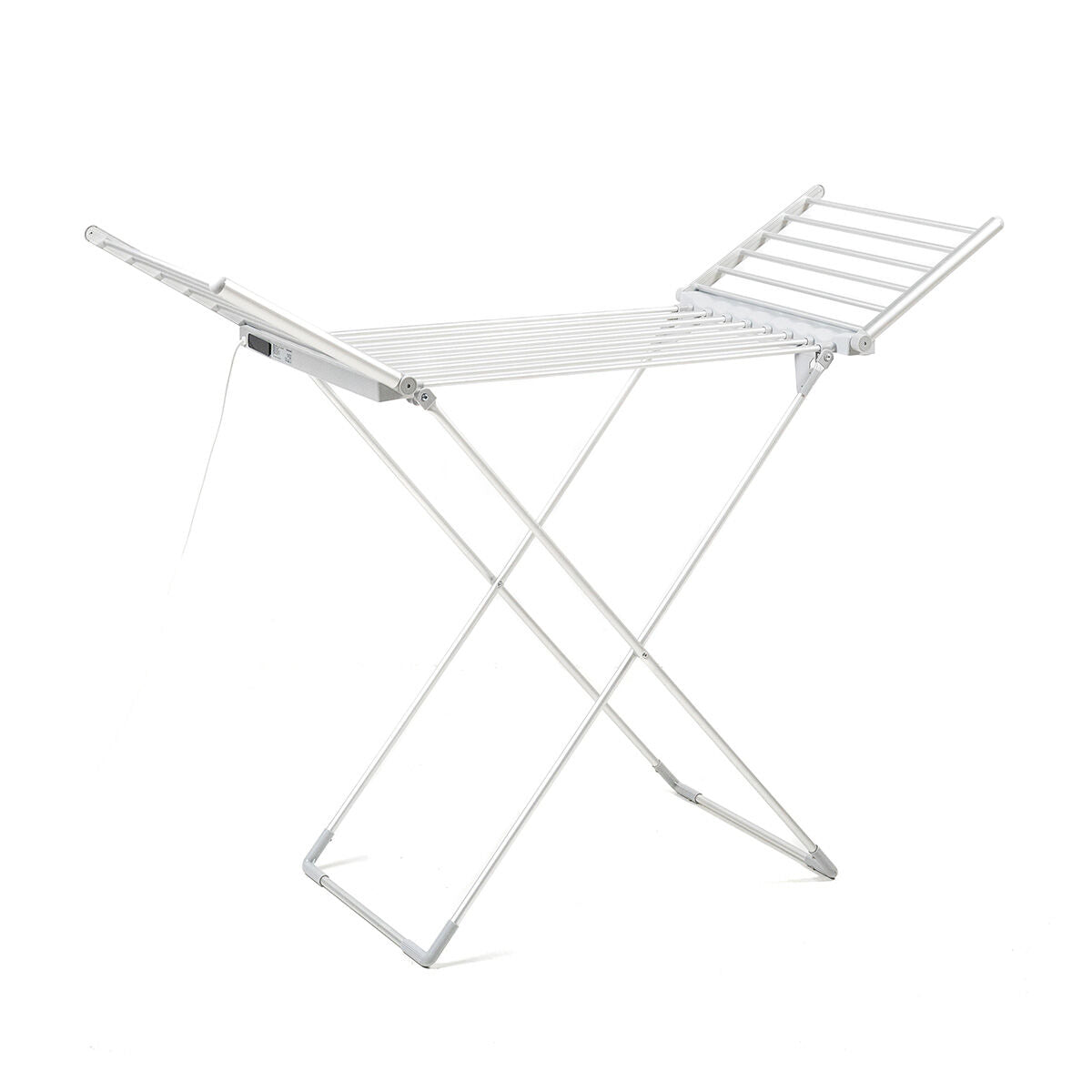 Un moderno tendedero portátil que dispone de pantalla digital con panel de control táctil, temperatura ajustable (6 niveles: 35-60 ºC) y temporizador (12 h). Ligero, resistente y estable, con estructura de aluminio y diseño en forma de X. Soporta hasta 15 kg. Potencia: 230 W.