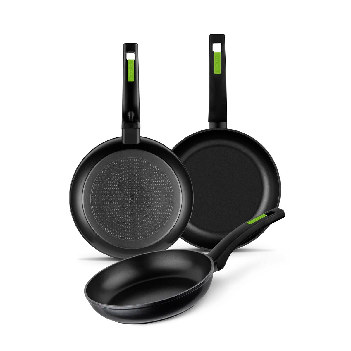 Los modelos Green son ideales para quienes buscan un equilibrio ventajoso entre precio y rendimiento. Con aluminio forjado de 3,5-3,8 mm y antiadherente bicapa sin PFOA.