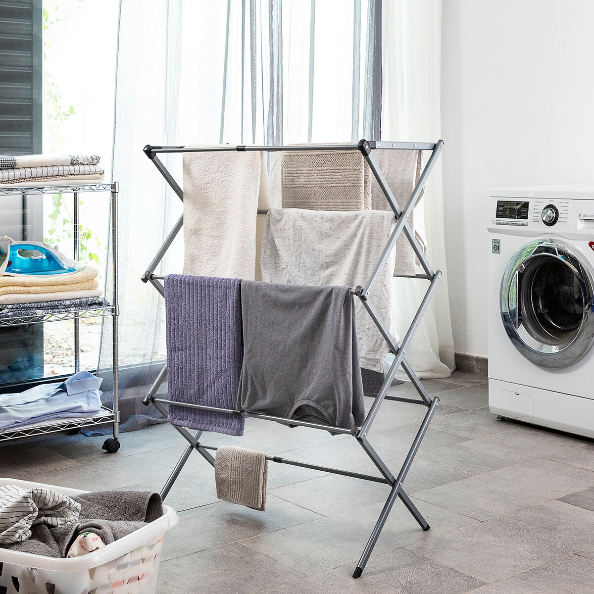 Su diseño permite adaptarlo a la cantidad de ropa para tender en cada momento y guardarlo con total comodidad, ocupando el mínimo espacio.